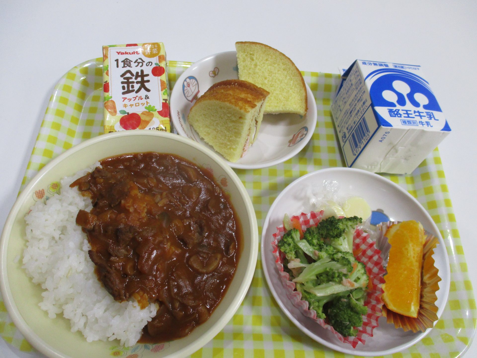 給食:ハヤシライス・ブロッコリーサラダ・チーズ・野菜ジュース・オレンジ