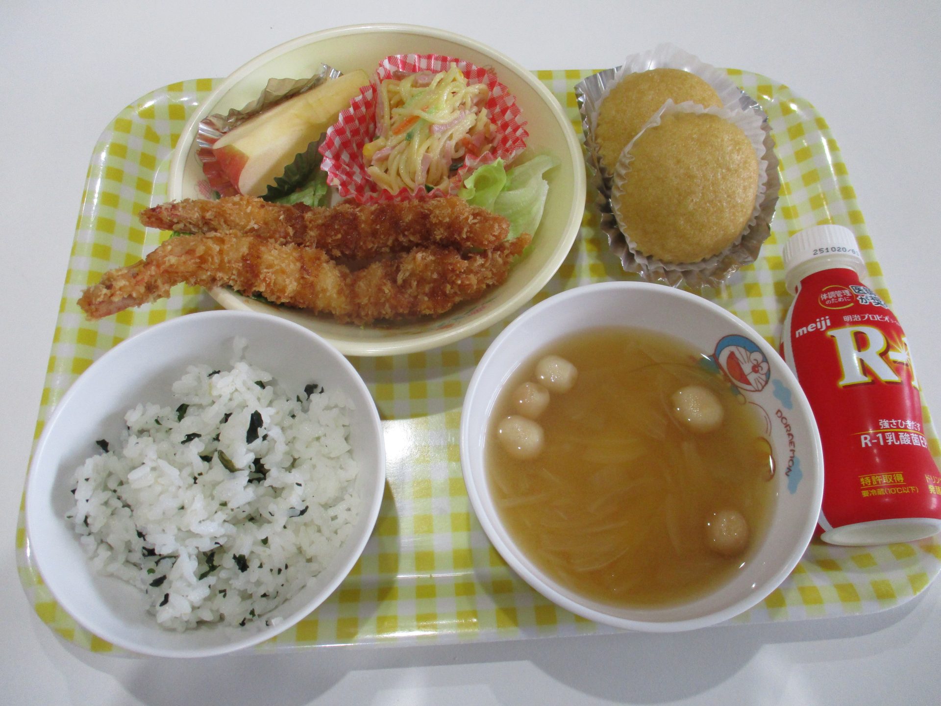 給食:わかめご飯・エビフライ・スパサラ・みそ汁・りんご