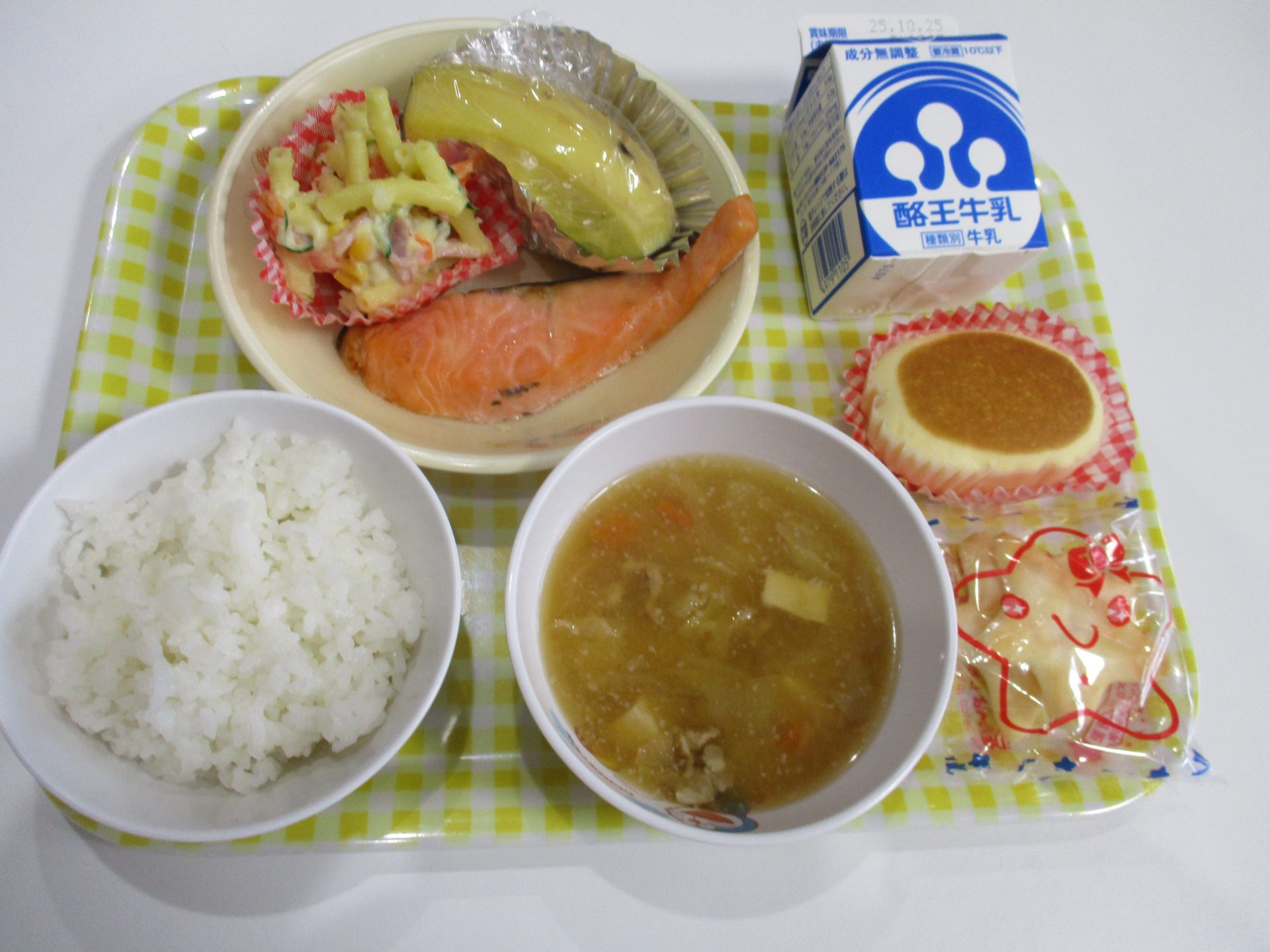 焼き魚(鮭)・マカロニサラダ・豚汁・バナナ