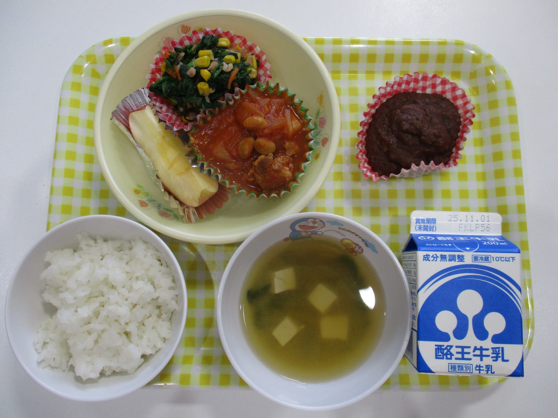 ポークビーンズ・ほうれん草のソテー・みそ汁・りんご