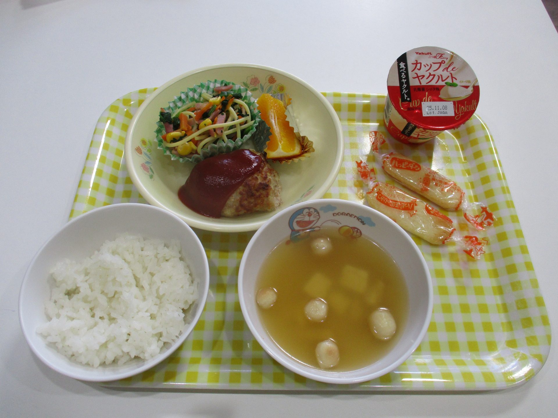 給食:ハンバーグ・ほうれん草のスパゲッティ・みそ汁・オレンジ