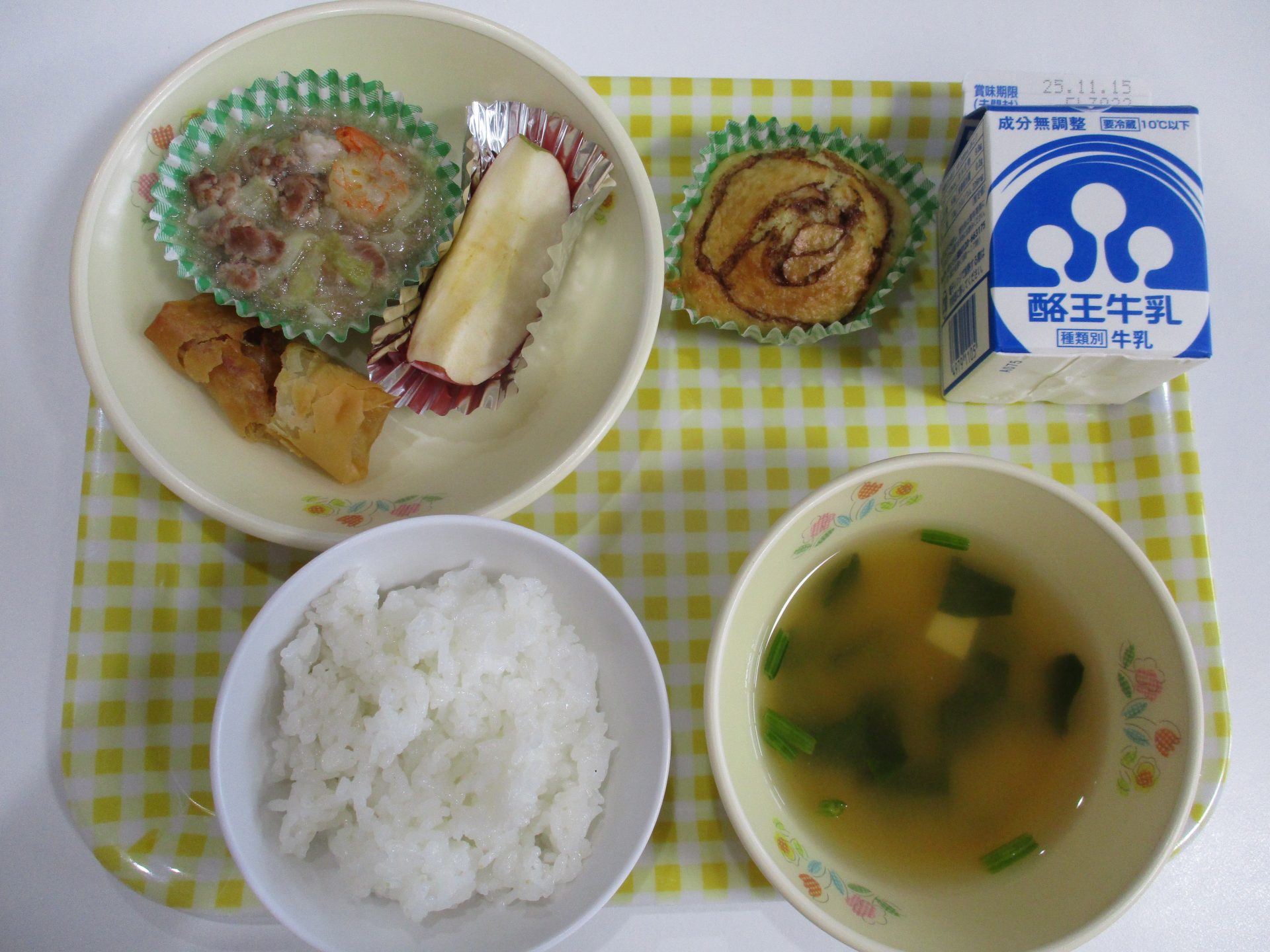 雑穀米入りご飯・八宝菜・春巻きみそ汁・りんご