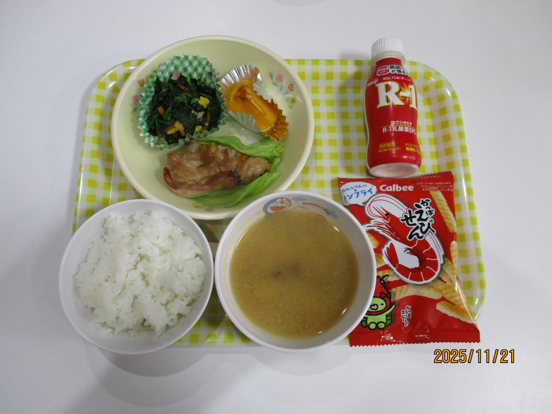 とり肉のマーマレード焼き・ほうれん草のソテー・みそ汁・柿