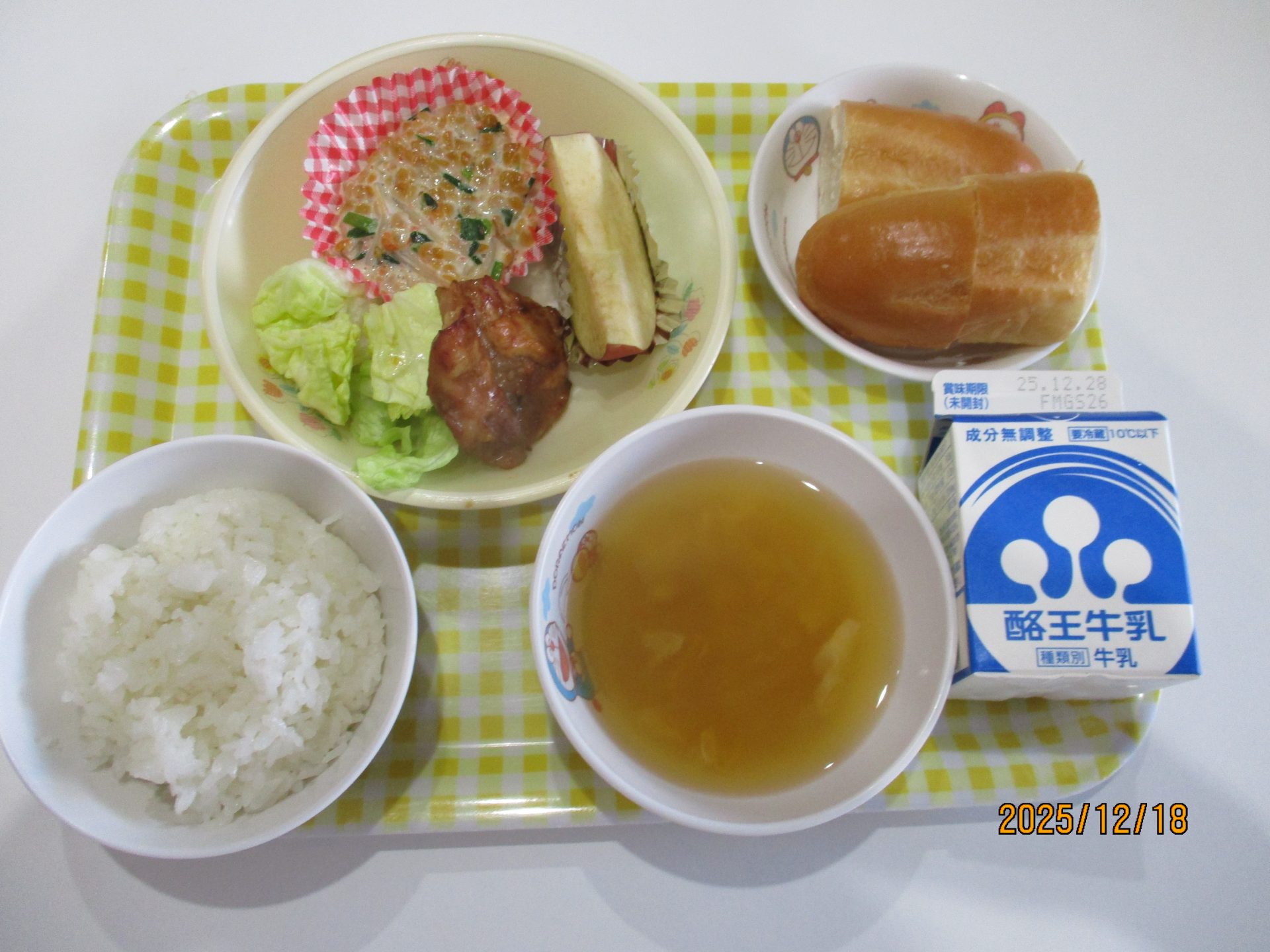 雑穀米入りご飯・鶏肉の照り焼き・納豆和え・みそ汁・りんご