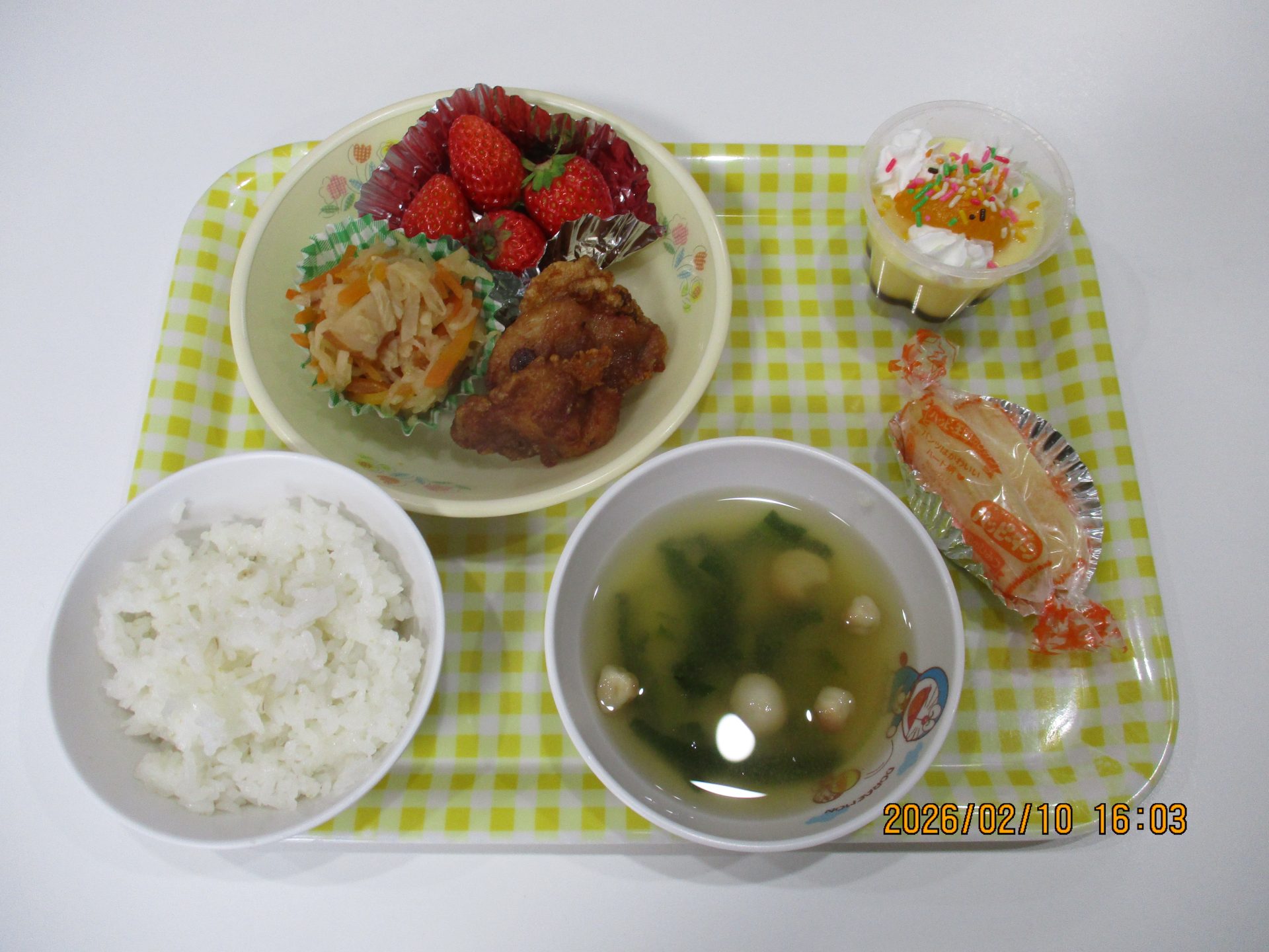 雑穀米入りご飯・鶏肉のから揚げ・切り干し大根の煮つけ・みそ汁・いちご