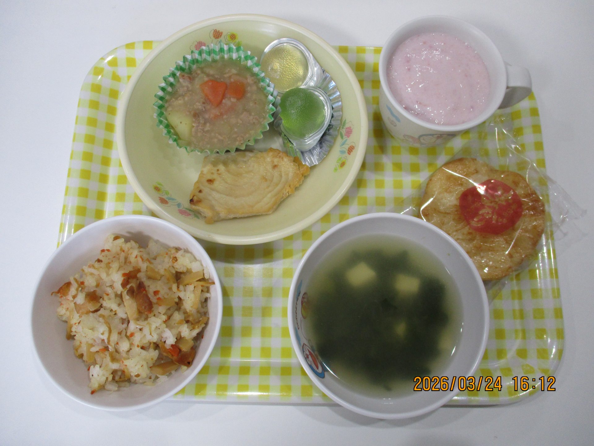 ・たけのこご飯・メカジキの味噌マヨネーズ焼き・じゃがいものそぼろ煮・ゼリー