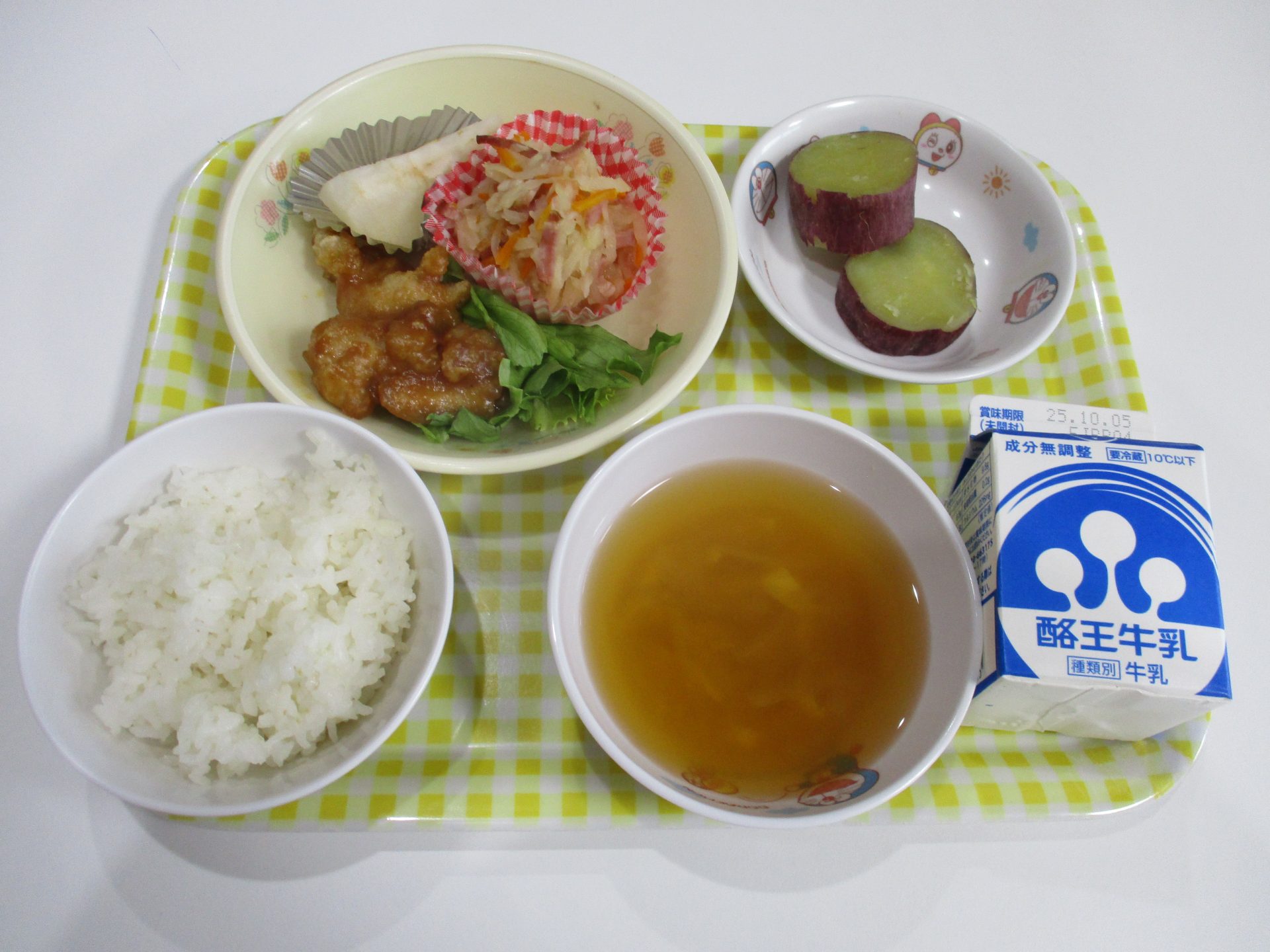 給食:雑穀米入りご飯・とりのみそがらめ・切り干し大根洋風煮・みそ汁・梨