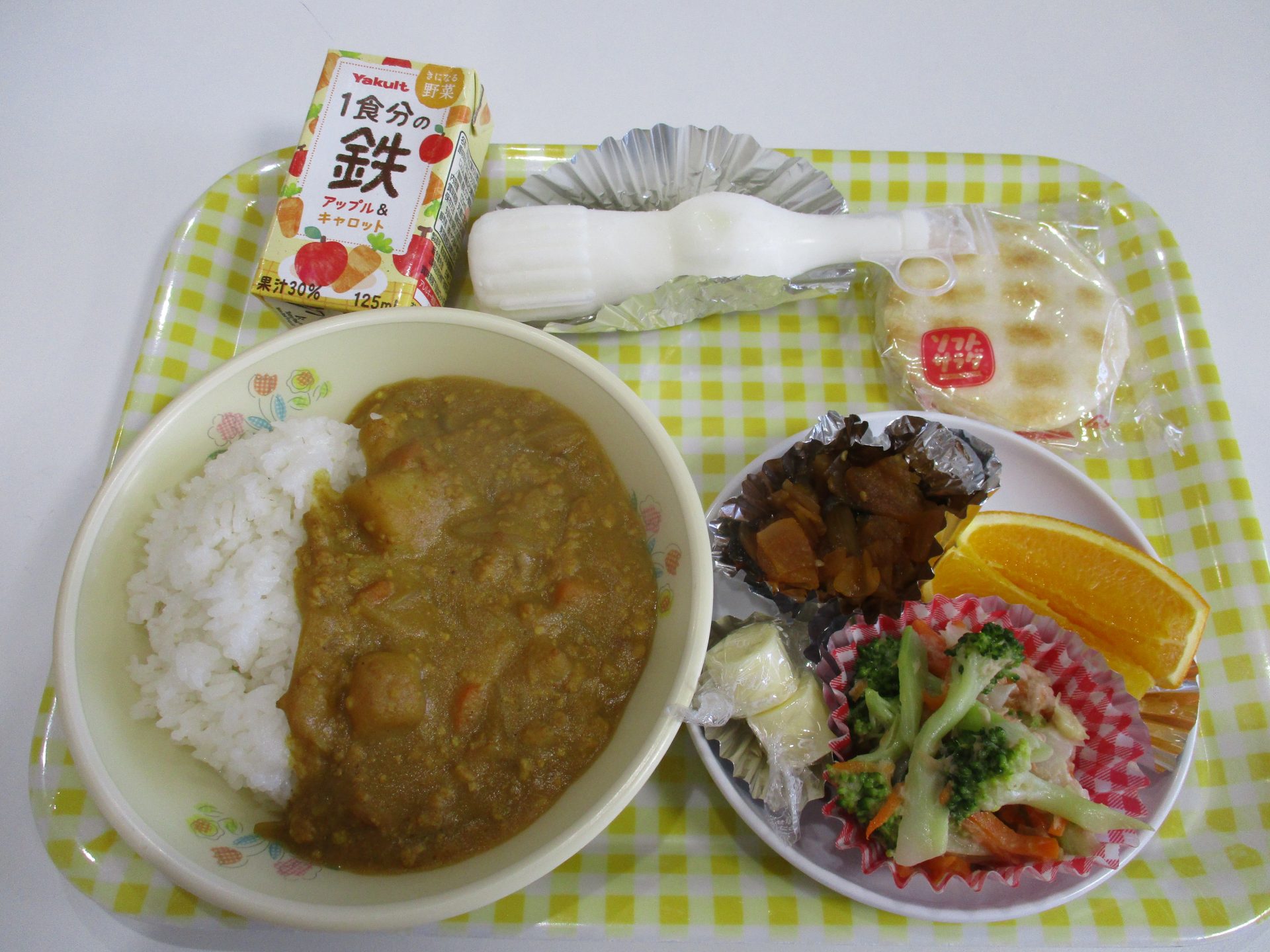 給食:キーマカレー・ブロッコリーサラダ・チーズ・野菜ジュース・オレンジ